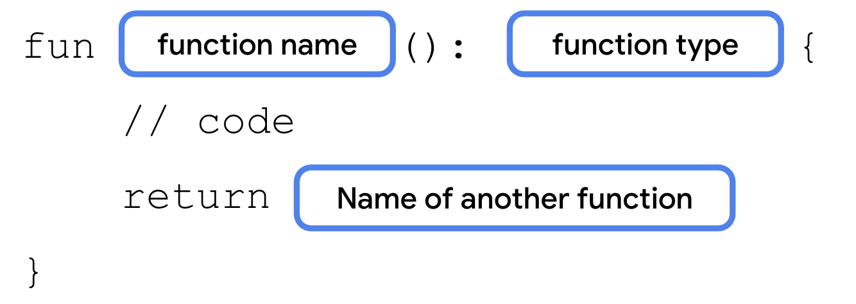 fun trickOrTreat(isTrick: Boolean, extraTreat: (Int) -> String): () -> Unit { if (isTrick) { return trick } else { println(extraTreat(5)) return treat }}fun main() { val coins: (Int) -> String = { quantity -> "$quantity quarters" } val cupcake: (Int) -> String = { "Have a cupcake!" } val treatFunction = trickOrTreat(false, coins) val trickFunction = trickOrTreat(true, cupcake) treatFunction() trickFunction()}val trick = { println("No treats!")}val treat = { println("Have a treat!")}