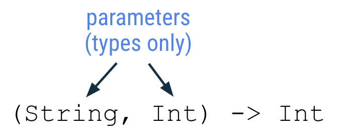 When declaring function types, the parameters aren’t labeled. You only need to specify the data types of each parameter, separated by a comma. The syntax is illustrated in this image: